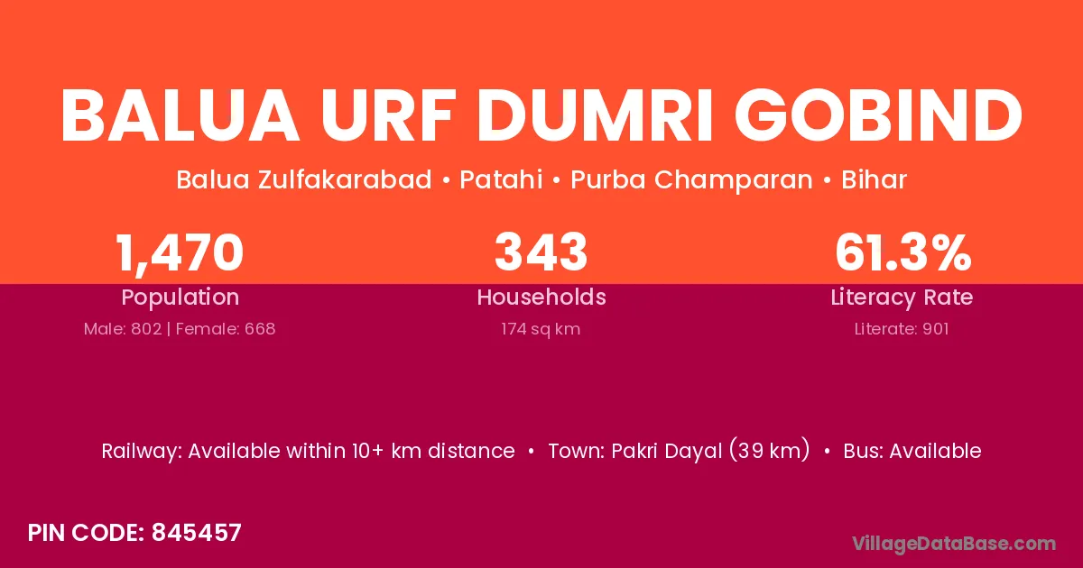 Pakri Dayal (39 km) is the nearest town to Balua Urf Dumri Gobind village for major economic activities and is located approximately 39 km away.