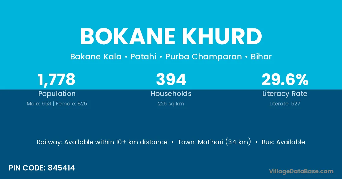 Motihari (34 km) is the nearest town to Bokane Khurd village for major economic activities and is located approximately 34 km away.