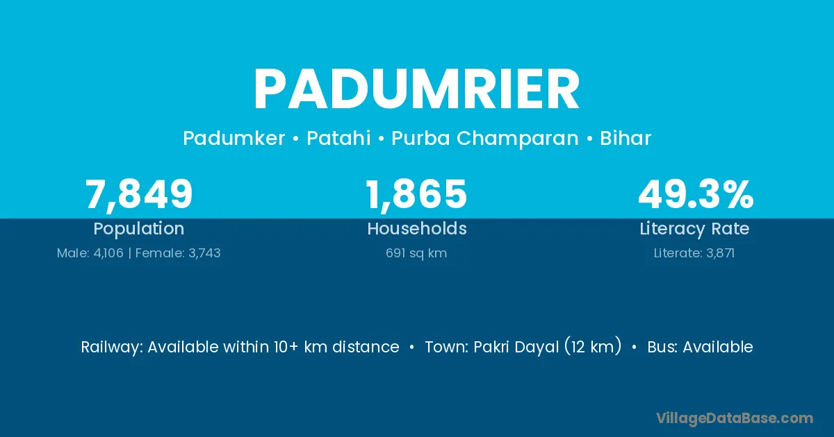 Pakri Dayal (12 km) is the nearest town to Padumrier village for major economic activities and is located approximately 12 km away.