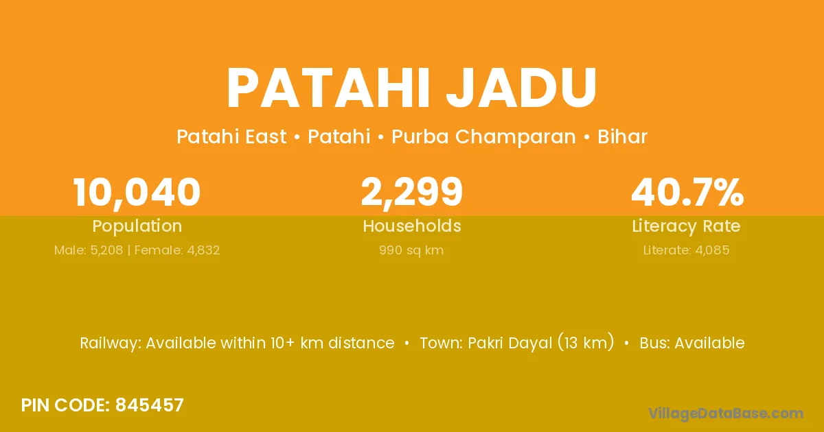 Pakri Dayal (13 km) is the nearest town to Patahi Jadu village for major economic activities and is located approximately 13 km away.