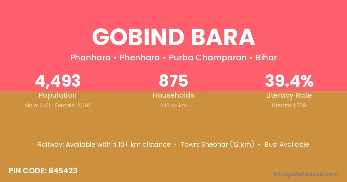 Sheohar (12 km) is the nearest town to Gobind Bara village for major economic activities and is located approximately 12 km away.