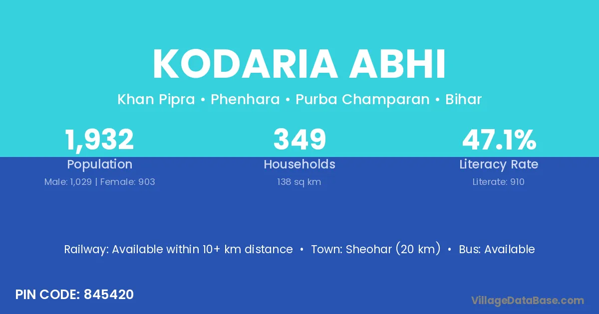 Sheohar (20 km) is the nearest town to Kodaria Abhi village for major economic activities and is located approximately 20 km away.