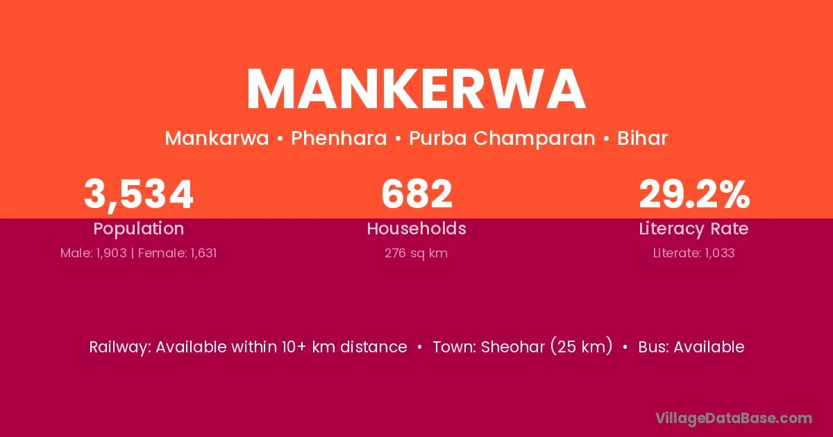 Sheohar (25 km) is the nearest town to Mankerwa village for major economic activities and is located approximately 25 km away.