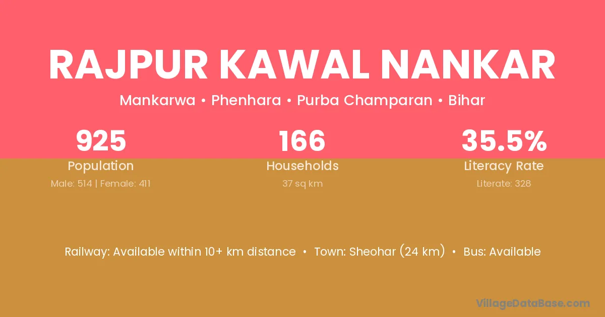 Sheohar (24 km) is the nearest town to Rajpur Kawal Nankar village for major economic activities and is located approximately 24 km away.