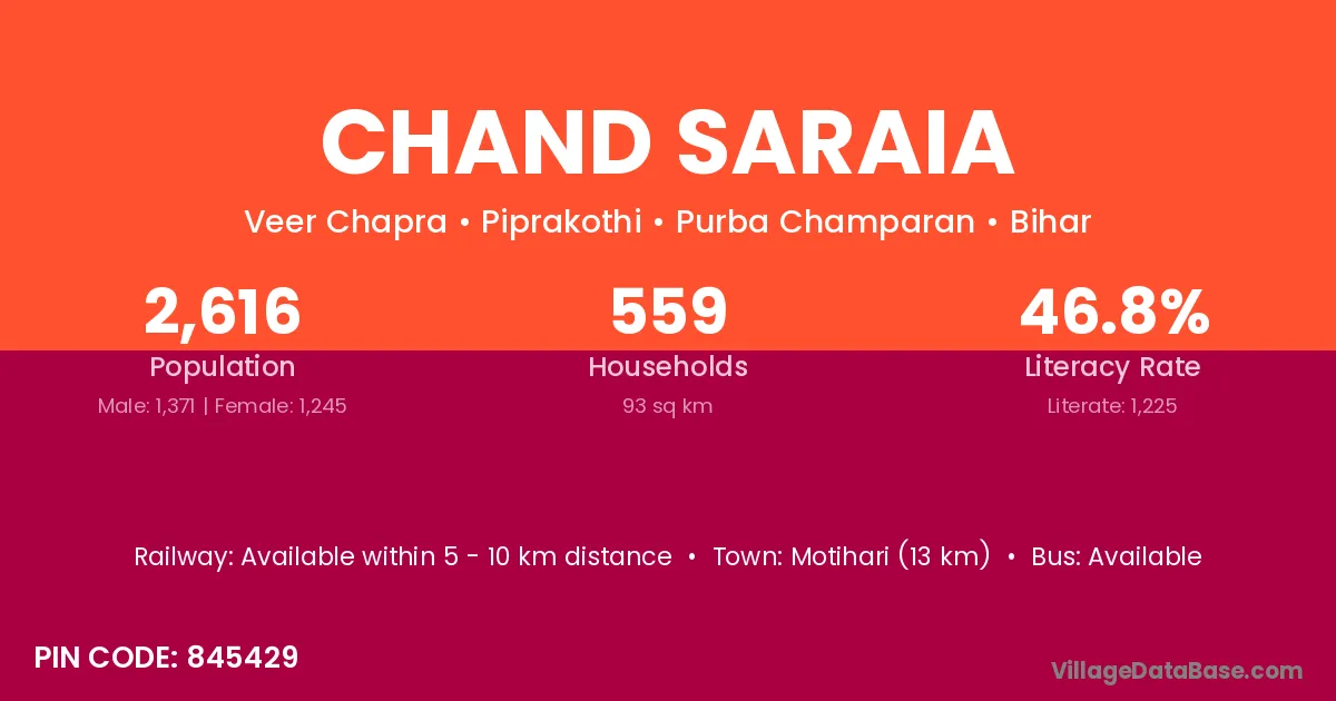 Motihari (13 km) is the nearest town to Chand Saraia village for major economic activities and is located approximately 13 km away.