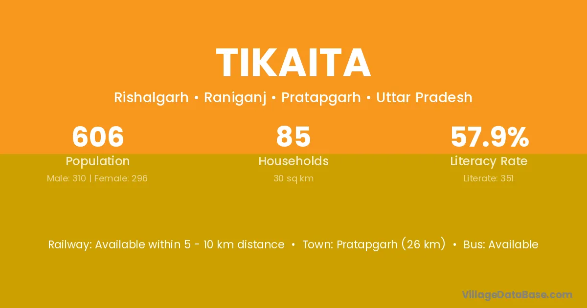 The literacy rate of Tikaita village is 58.39%. Male literacy stands at 66.60% and female literacy at 49.38%.