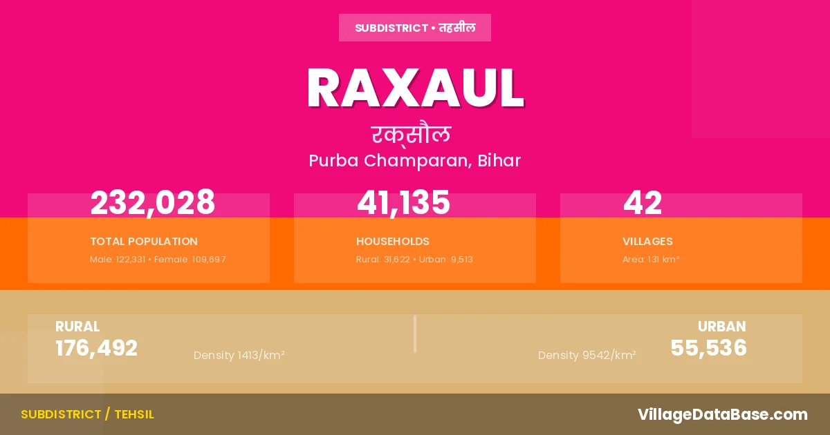 According to the 2011 census The total area of Raxaul Subdivision is 131 km², with a population of 232028 people. The population density is 1,775 inhabitants per square kilometre, and there are approximately 41135 houses in the sub district.