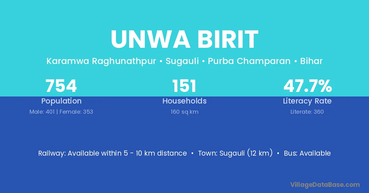 Sugauli (12 km) is the nearest town to Unwa Birit village for major economic activities and is located approximately 12 km away.
