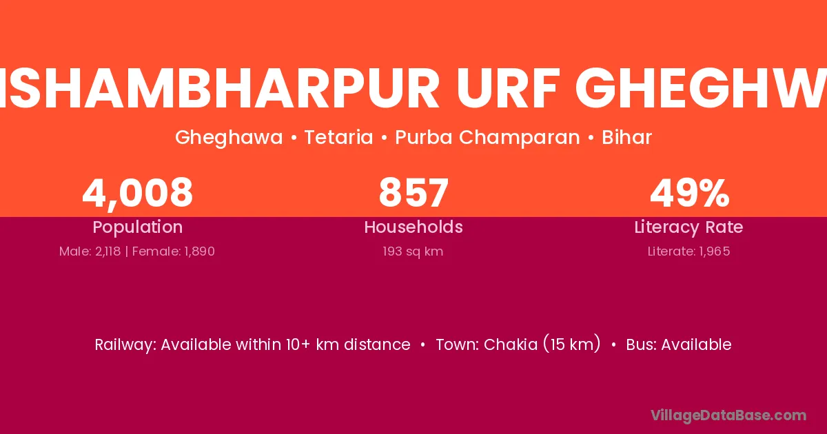 Chakia (15 km) is the nearest town to Bishambharpur Urf Gheghwa village for major economic activities and is located approximately 15 km away.