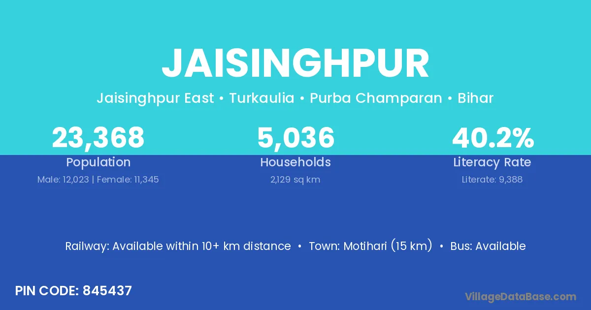 Motihari (15 km) is the nearest town to Jaisinghpur village for major economic activities and is located approximately 15 km away.