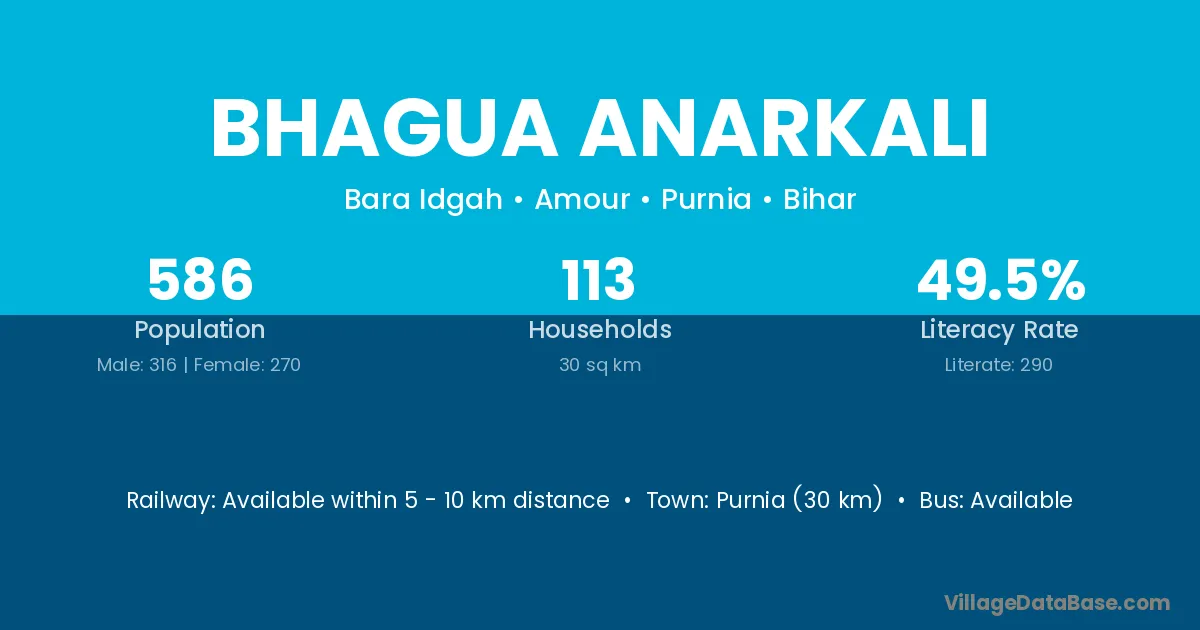 Purnia (30 km) is the nearest town to Bhagua Anarkali village for major economic activities and is located approximately 30 km away.