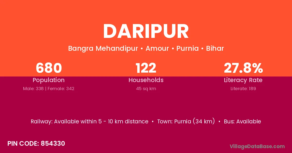 Purnia (34 km) is the nearest town to Daripur village for major economic activities and is located approximately 34 km away.