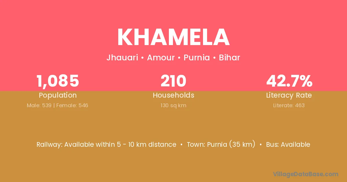 Purnia (35 km) is the nearest town to Khamela village for major economic activities and is located approximately 35 km away.