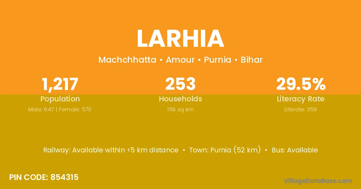Purnia (52 km) is the nearest town to Larhia village for major economic activities and is located approximately 52 km away.