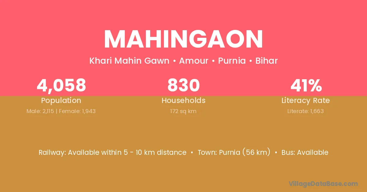 Purnia (56 km) is the nearest town to Mahingaon village for major economic activities and is located approximately 56 km away.