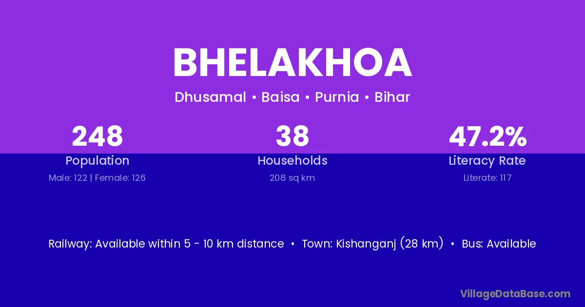 Bhelakhoa village has a total population of 248 people, of which 122 are males and 126 are females.