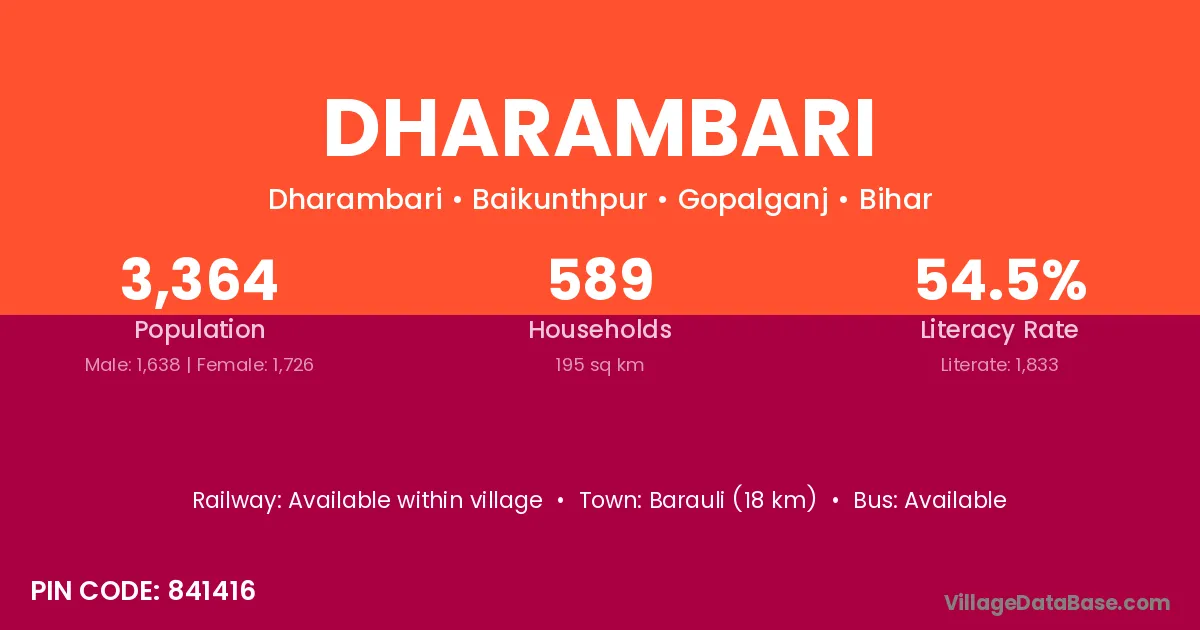 The literacy rate of Dharambari village is 54.27%. Male literacy stands at 61.48% and female literacy at 45.50%.