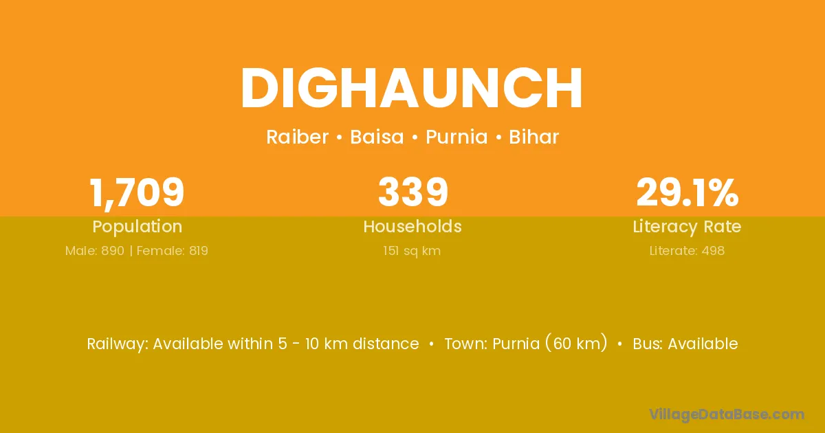 Purnia (60 km) is the nearest town to Dighaunch village for major economic activities and is located approximately 60 km away.