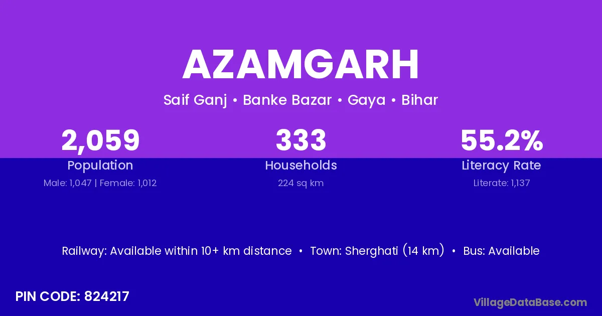 Purnia (34 km) is the nearest town to Azamgarh village for major economic activities and is located approximately 34 km away.