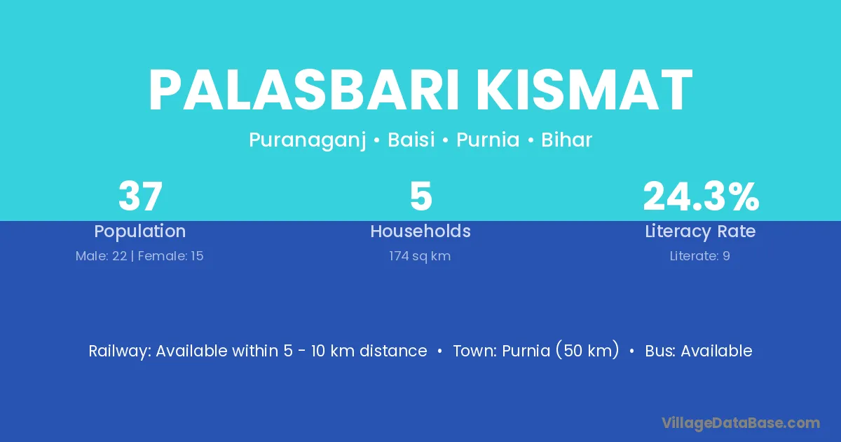 Purnia (50 km) is the nearest town to Palasbari Kismat village for major economic activities and is located approximately 50 km away.