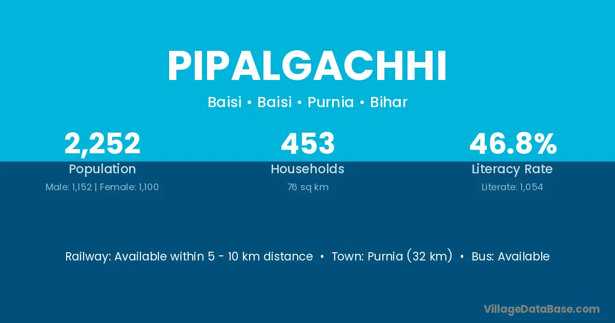 Purnia (32 km) is the nearest town to Pipalgachhi village for major economic activities and is located approximately 32 km away.