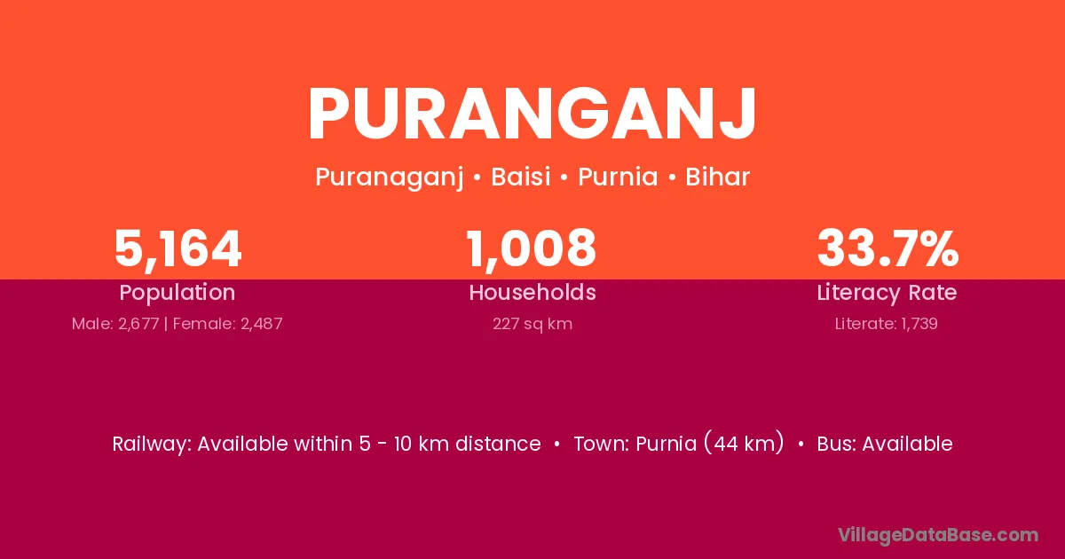 Purnia (44 km) is the nearest town to Puranganj village for major economic activities and is located approximately 44 km away.