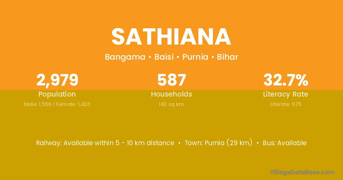 Purnia (29 km) is the nearest town to Sathiana village for major economic activities and is located approximately 29 km away.