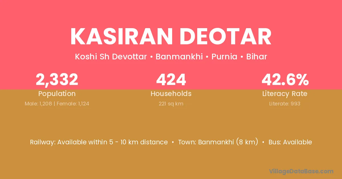 Banmankhi (8 km) is the nearest town to Kasiran Deotar village for major economic activities and is located approximately 8 km away.