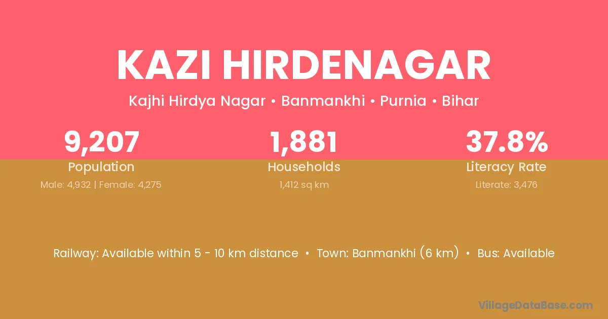 Banmankhi (6 km) is the nearest town to Kazi Hirdenagar village for major economic activities and is located approximately 6 km away.