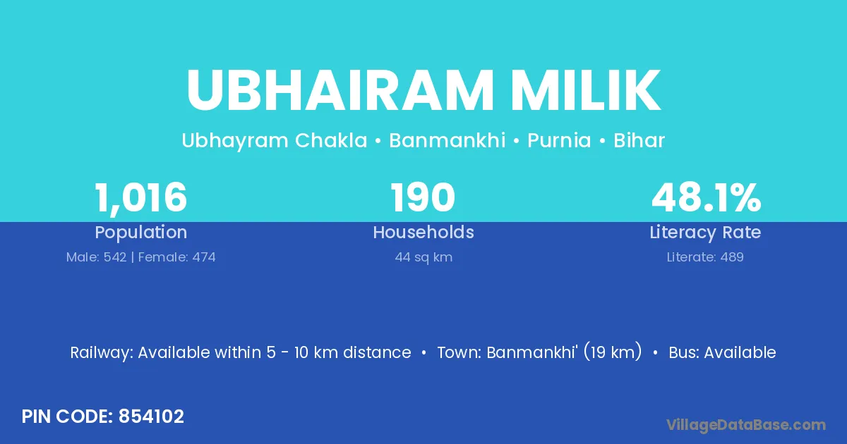 Ubhairam Milik village has a total population of 1,016 people, of which 542 are males and 474 are females.