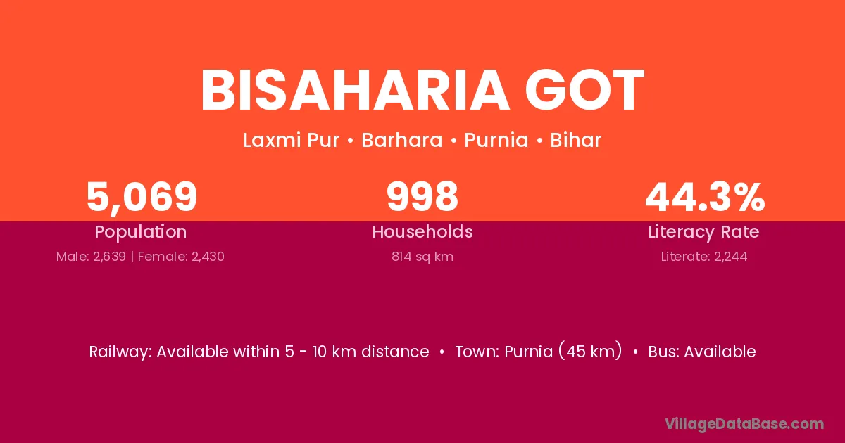 Purnia (45 km) is the nearest town to Bisaharia Got village for major economic activities and is located approximately 45 km away.