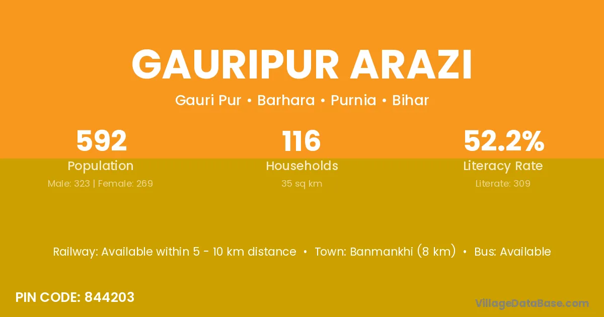 Banmankhi (8 km) is the nearest town to Gauripur Arazi village for major economic activities and is located approximately 8 km away.