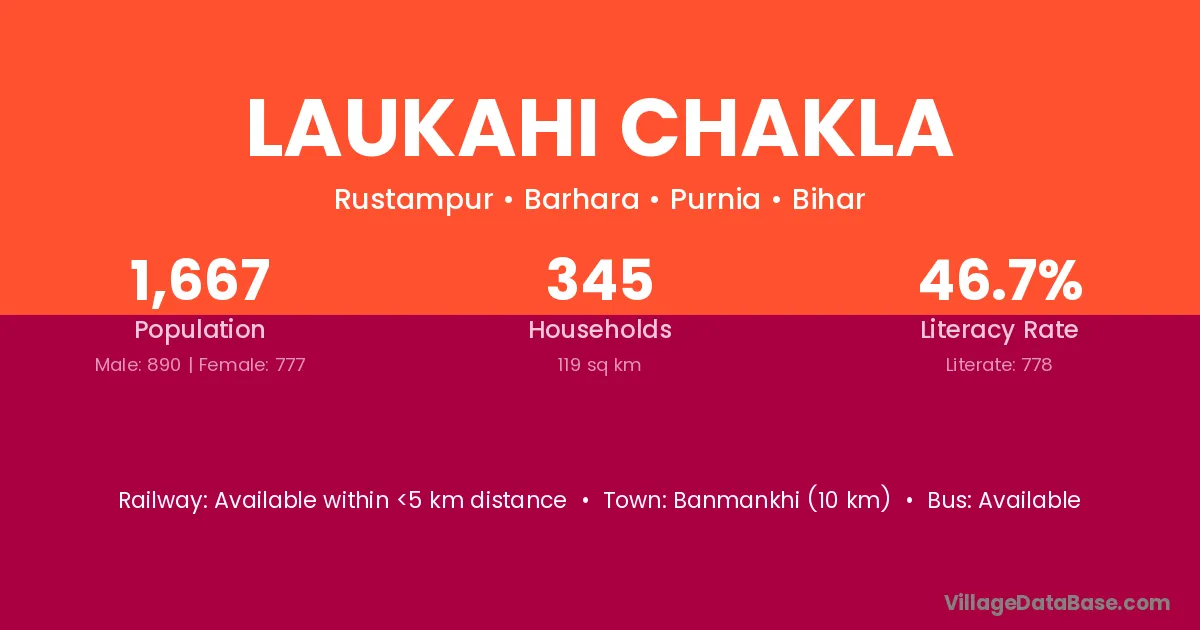 Banmankhi (10 km) is the nearest town to Laukahi Chakla village for major economic activities and is located approximately 10 km away.