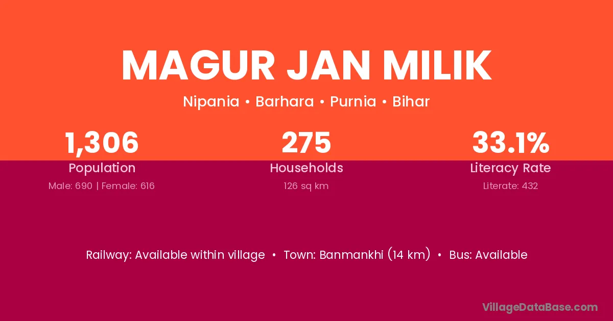 Banmankhi (14 km) is the nearest town to Magur Jan Milik village for major economic activities and is located approximately 14 km away.