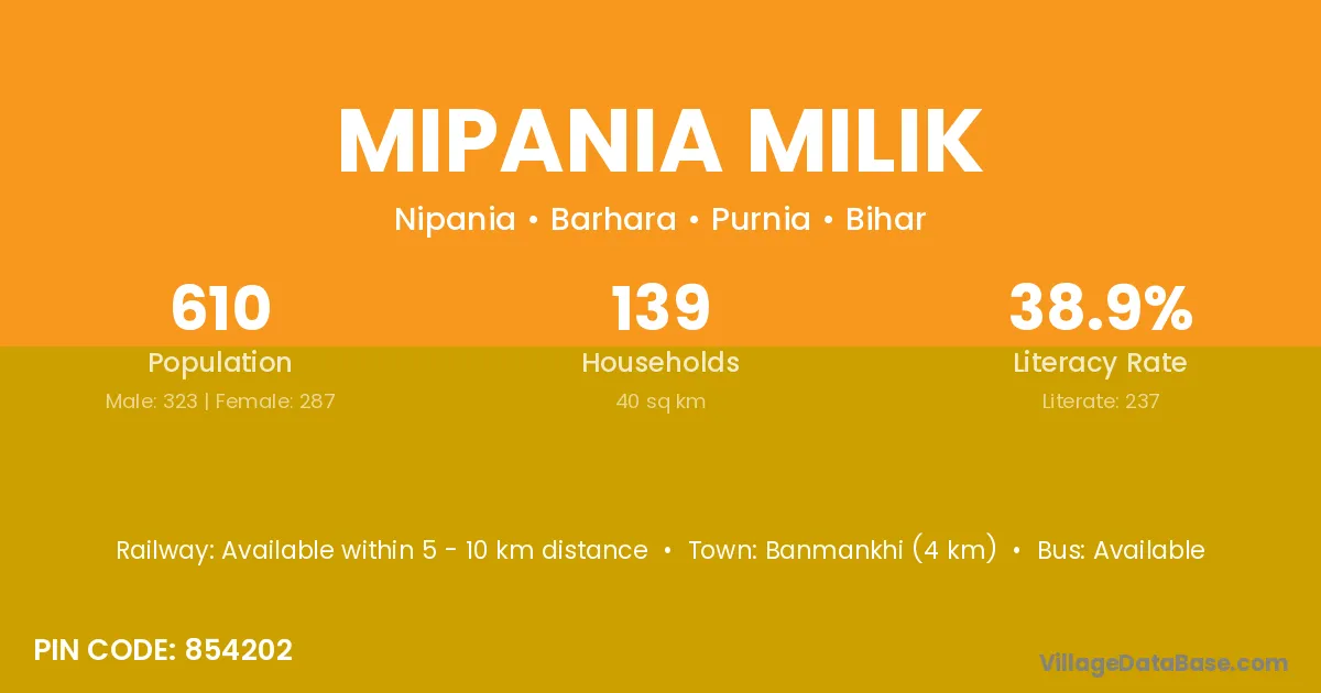 Banmankhi (4 km) is the nearest town to Mipania Milik village for major economic activities and is located approximately 4 km away.