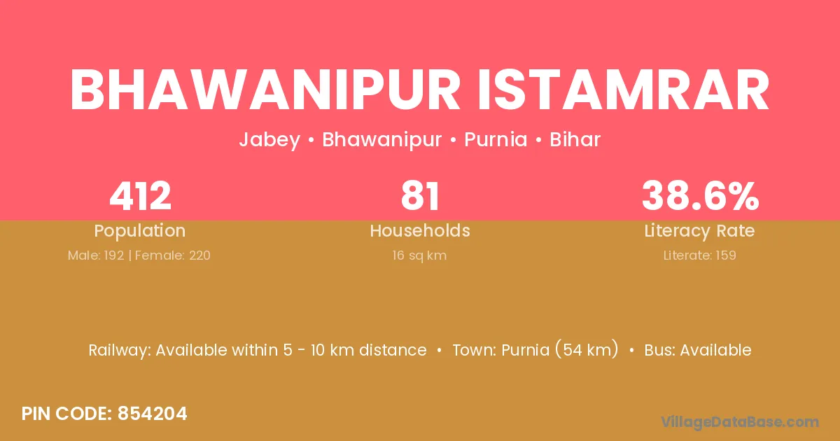 Bhawanipur Istamrar village has a total population of 412 people, of which 192 are males and 220 are females.