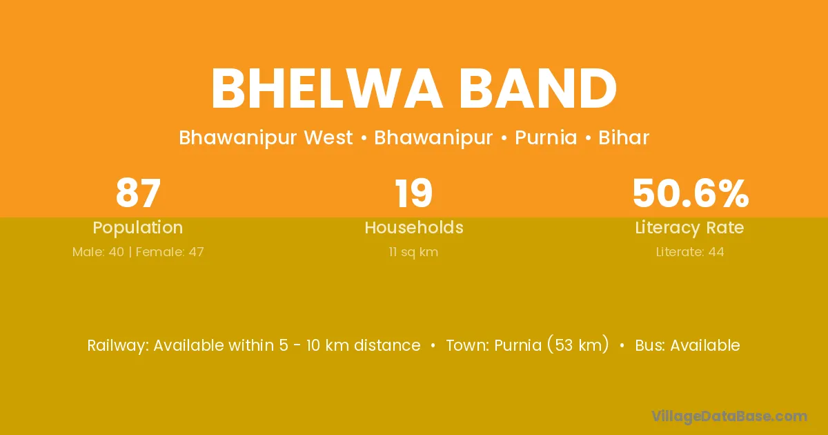Purnia (53 km) is the nearest town to Bhelwa Band village for major economic activities and is located approximately 53 km away.