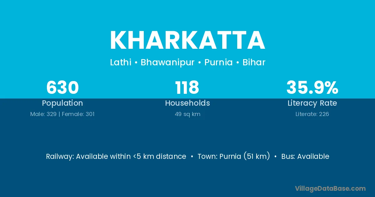 Purnia (51 km) is the nearest town to Kharkatta village for major economic activities and is located approximately 51 km away.