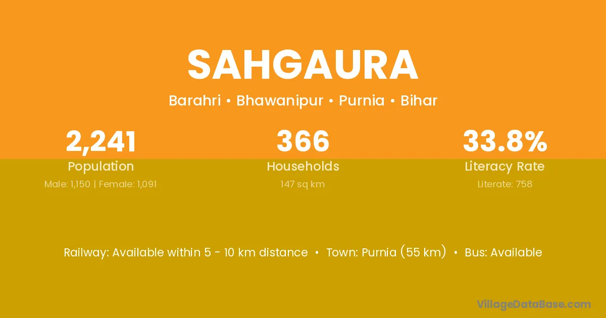 Purnia (55 km) is the nearest town to Sahgaura village for major economic activities and is located approximately 55 km away.