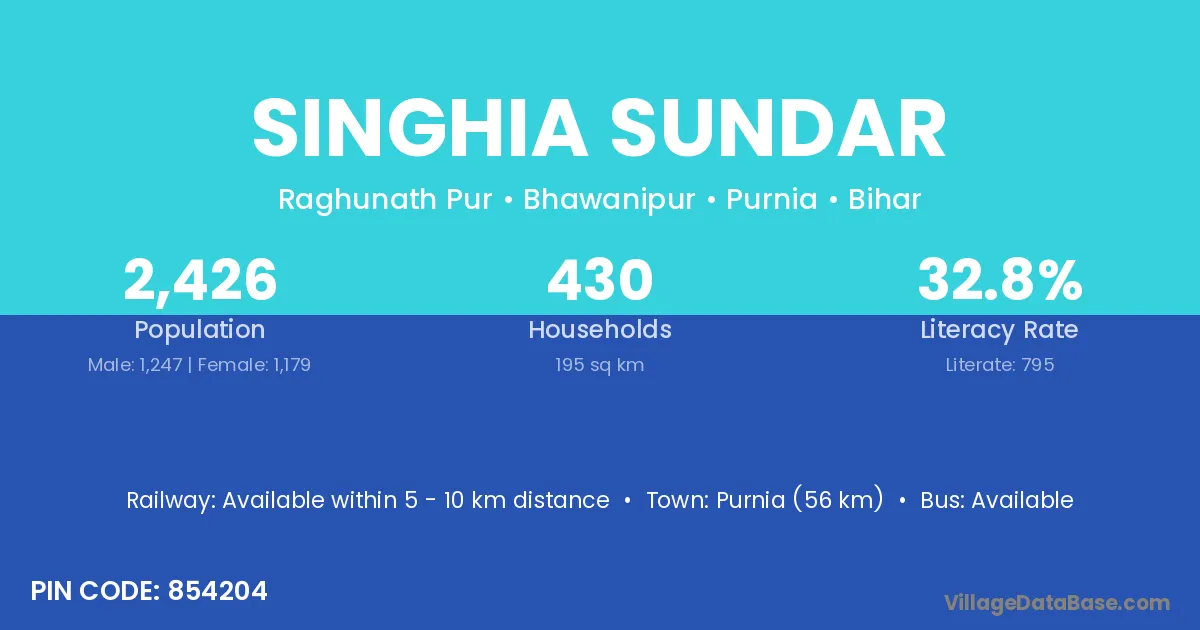Purnia (56 km) is the nearest town to Singhia Sundar village for major economic activities and is located approximately 56 km away.