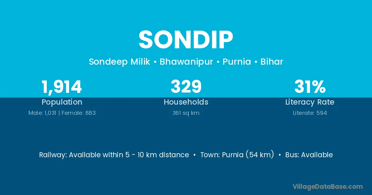 Purnia (54 km) is the nearest town to Sondip village for major economic activities and is located approximately 54 km away.