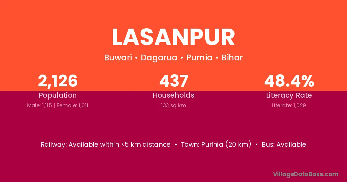 Purinia (20 km) is the nearest town to Lasanpur village for major economic activities and is located approximately 20 km away.