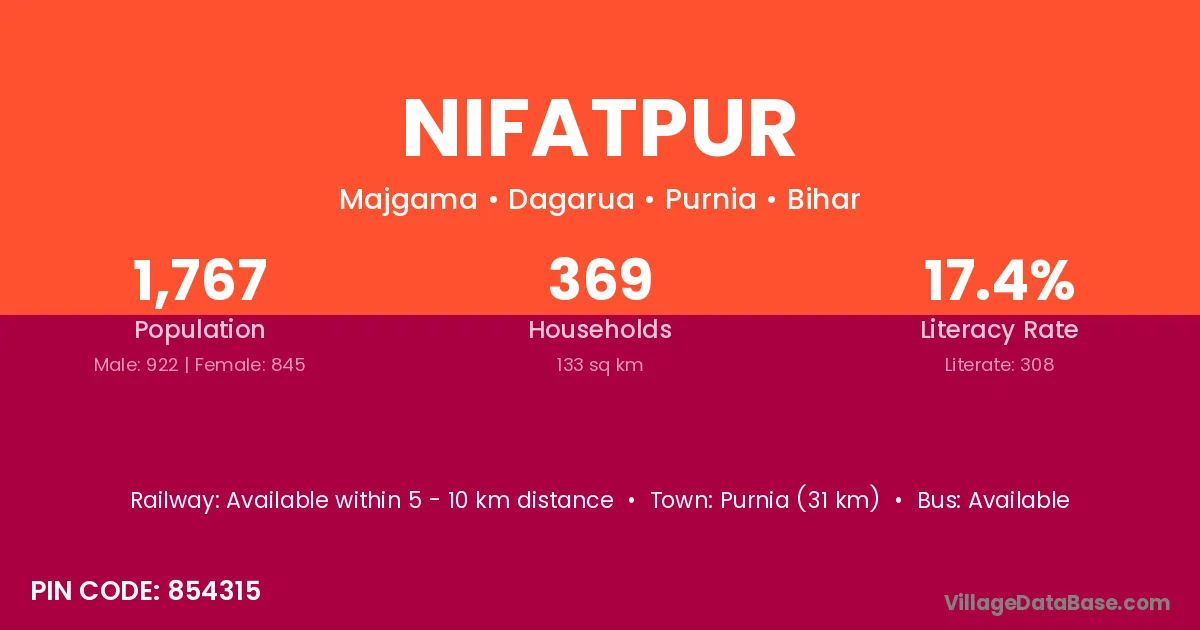 Purnia (31 km) is the nearest town to Nifatpur village for major economic activities and is located approximately 31 km away.