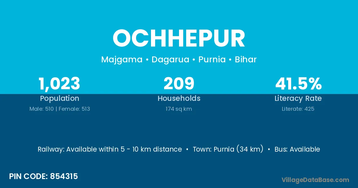 Purnia (34 km) is the nearest town to Ochhepur village for major economic activities and is located approximately 34 km away.