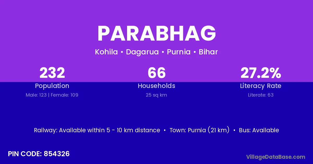Purnia (21 km) is the nearest town to Parabhag village for major economic activities and is located approximately 21 km away.