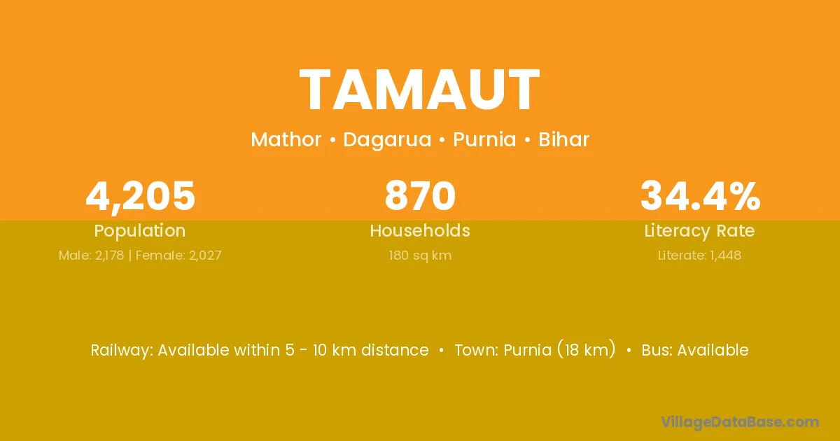 Purnia (18 km) is the nearest town to Tamaut village for major economic activities and is located approximately 18 km away.