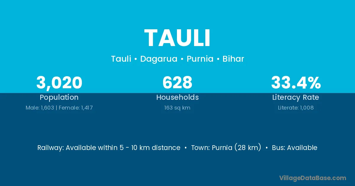 Purnia (28 km) is the nearest town to Tauli village for major economic activities and is located approximately 28 km away.