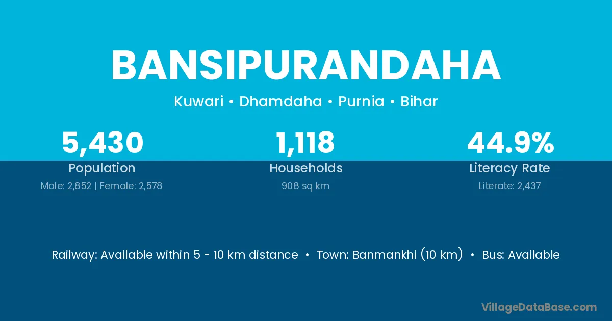 Banmankhi (10 km) is the nearest town to Bansipurandaha village for major economic activities and is located approximately 10 km away.