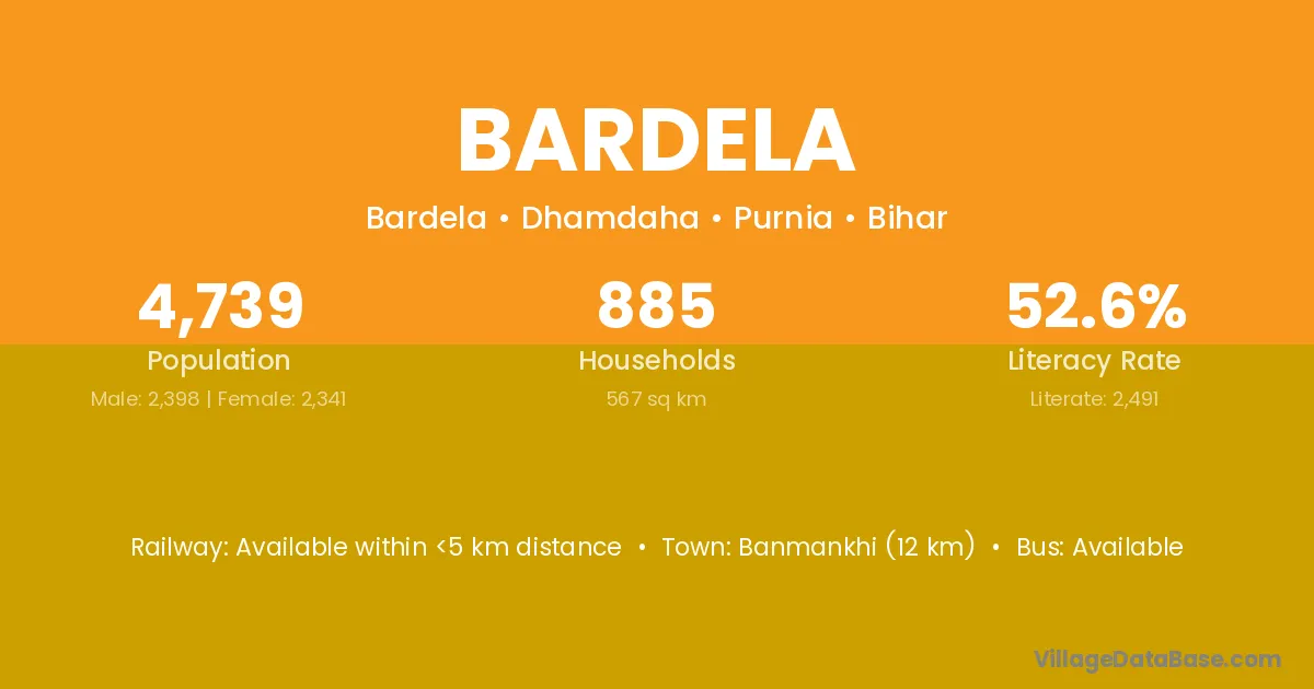 Banmankhi (12 km) is the nearest town to Bardela village for major economic activities and is located approximately 12 km away.