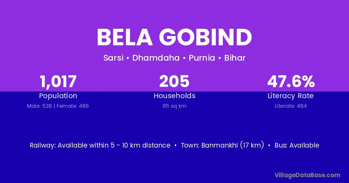 Banmankhi (17 km) is the nearest town to Bela Gobind village for major economic activities and is located approximately 17 km away.